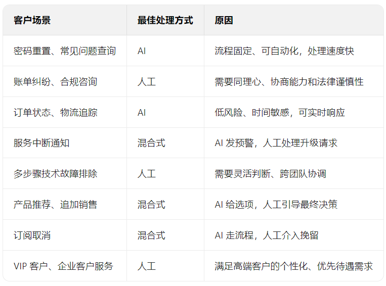 客户最烦等,AI 的核心优势就是 “快” 和 “不休息”,所以低风险、重复率高、不用动脑判断的活,交给它准没错,还能解放人工去处理更有价值的事。