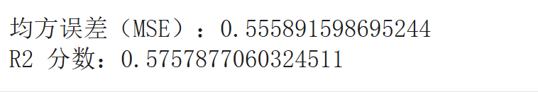 MSE(均方误差):衡量预测值与真实值之间的平均偏差,值越小表示模型表现越好。R²分数:表示模型解释数据方差的比例,值越接近 1,说明模型拟合度越高。