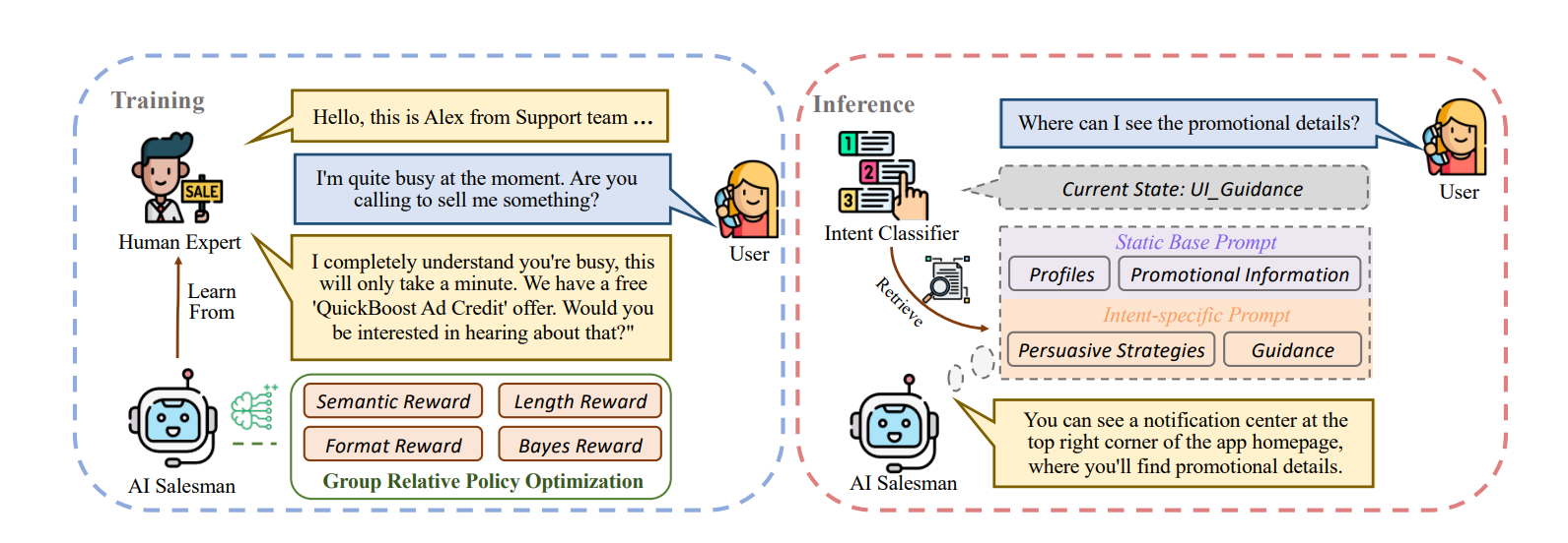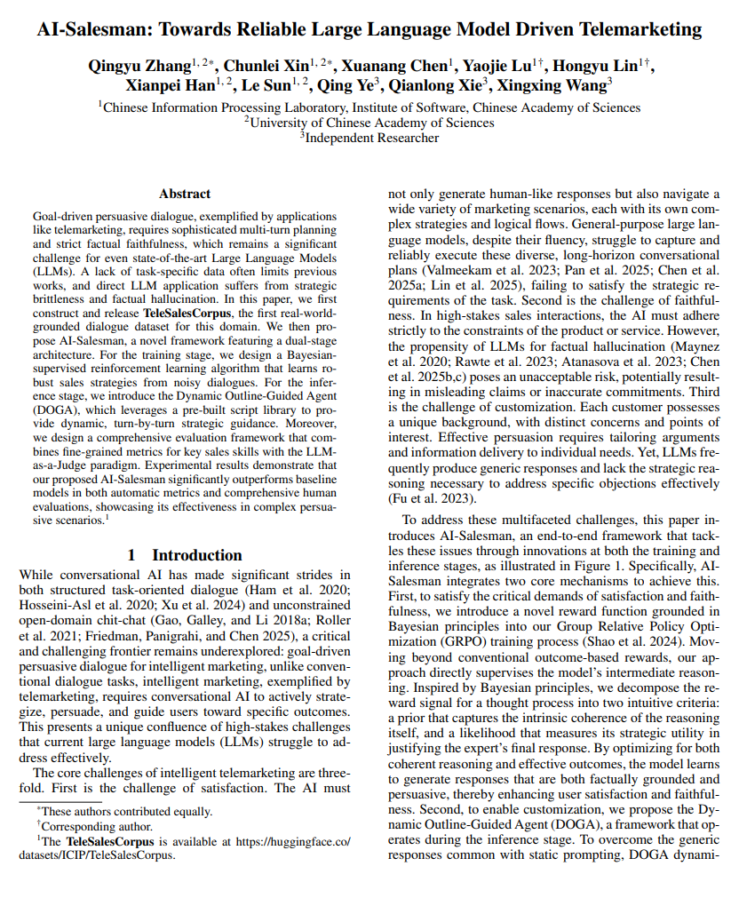 要实现定制化,关键在于让AI能根据客户实时反应调整策略。AI-Salesman在推理阶段引入动态大纲引导代理(DOGA),彻底告别静态话术模板的僵化。