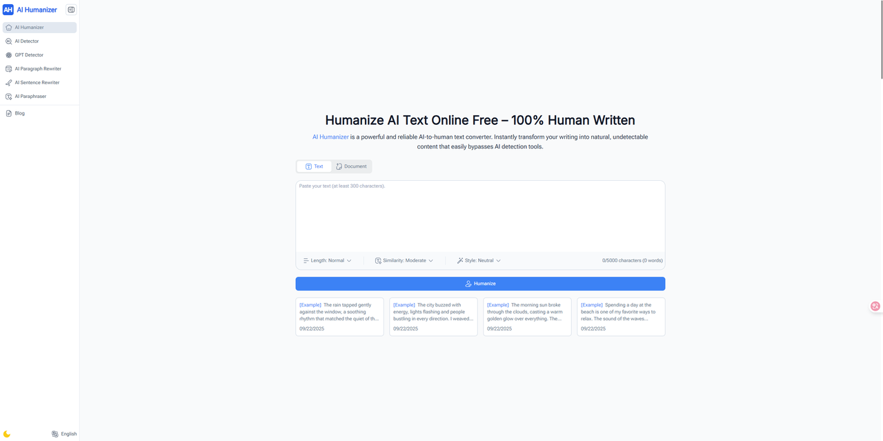 当你用AI生成了一份项目报告,数据都很准确,但读起来干巴巴的,毫无感染力。AI Humanizer 可以把它转换成既有专业性又不失可读性的文本,让汇报更出彩。