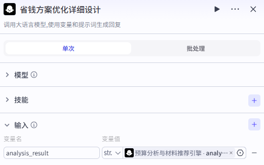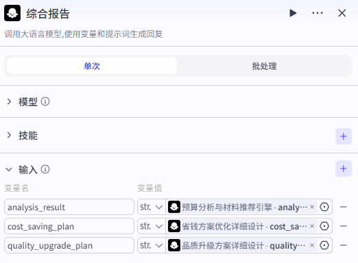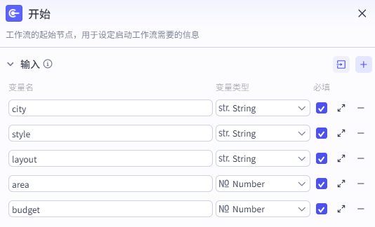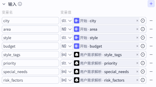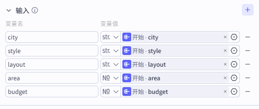 该节点是通过用户一开始输入的城市、户型、风格和系统给予的需求分析进行整体装修的预算分析和材料推荐,所以该节点接收的参数比较多,参数名也可与接收来的参数名一样,如图: