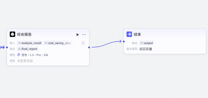 接收来自“省钱方案优化详细设计”节点、“品质升级方案详细设计”节点和条件2分支节点。命名为“综合报告”,模型选择“豆包·1.5·Pro·32k”。
