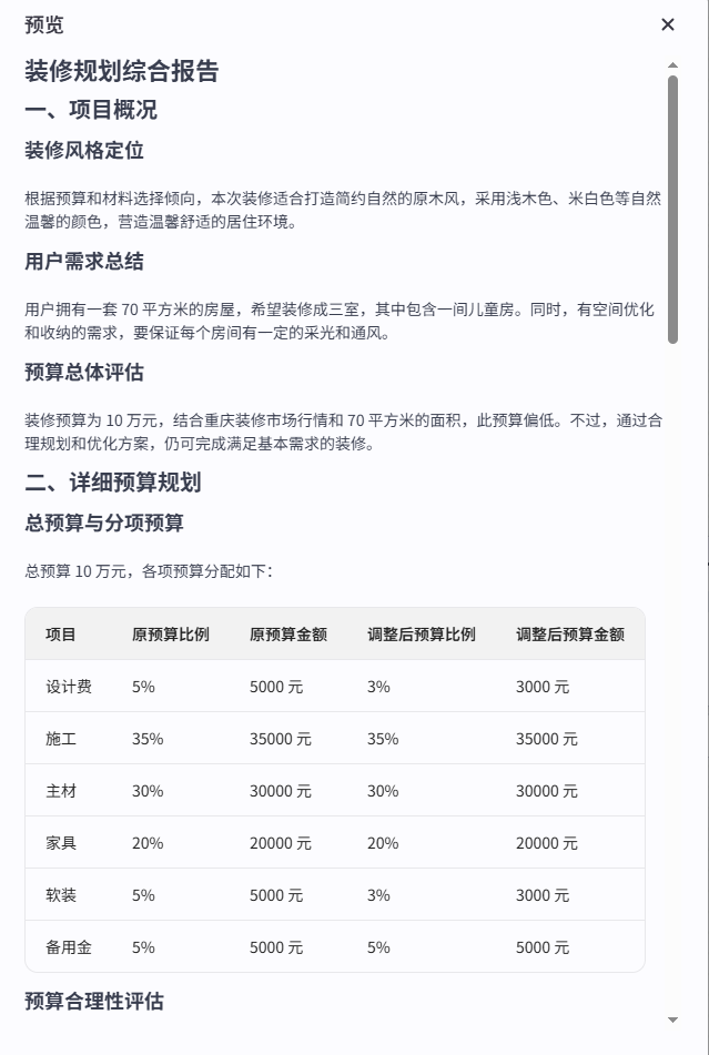 基于以上所有输入信息,生成一份结构完整、内容详实的装修规划综合报告。