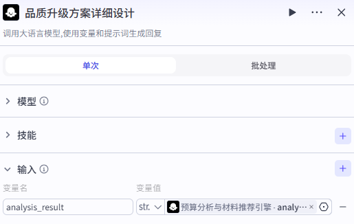 在“否则”分支后接入大模型节点,命名为“品质升级方案详细设计”,模型选择“豆包·1.5·Pro·32k”。