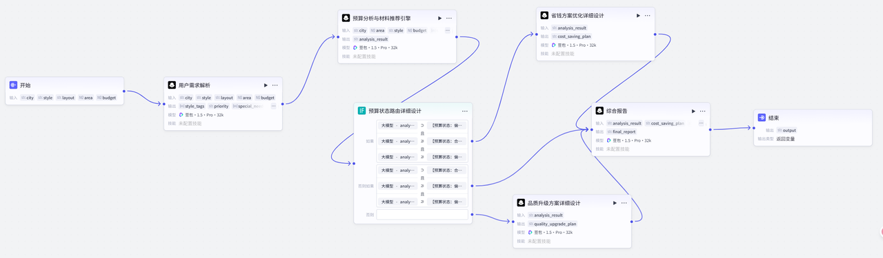 该阶段思路:通过整合所有分析结果,为用户生成一份详细、专业、可操作的装修规划方案。然后再给到结束节点,将方案输出出来。