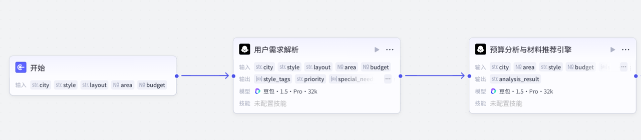 该阶段思路:系统根据用户输入的城市、户型风格、装修预算等数据来判断用户的真实需求,然后再输出整体预算和材料推荐分析。因此,该阶段需要三个节点来支撑,开始节点承接用户信息输入,大模型节点来进行用户需求分析和材料推荐,下面是具体每个节点的实操。