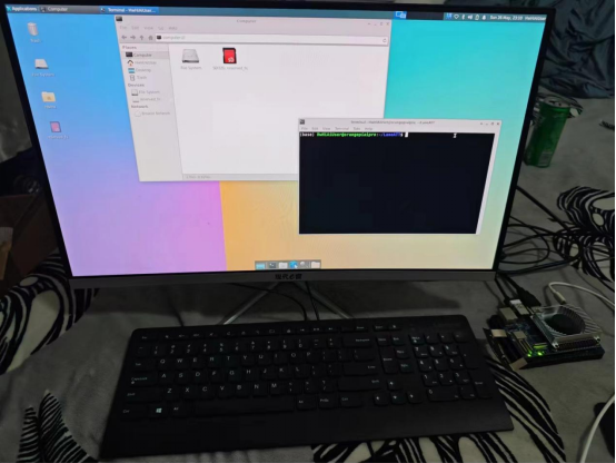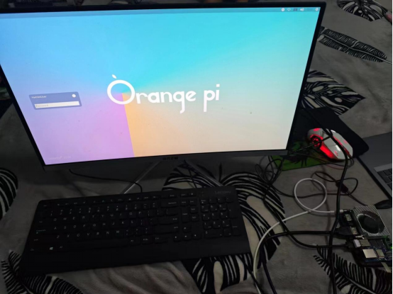香橙派的强大之处第一点就是只需要一个显示器就可以生成一个高性能的计算机,将显示器和开发板组合,开机,屏幕成功显示。