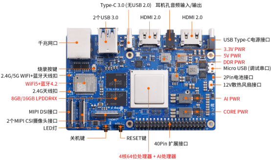 OrangePi AIpro(8T)采用昇腾AI技术路线,具体为4核64位处理器+AI处理器,集成图形处理器,支持8TOPS AI算力,拥有8GB/16GB LPDDR4X,可以外接32GB/64GB/128GB/256GB eMMC模块,支持双4K高清输出。 Orange Pi AIpro引用了相当丰富的接口,包括两个HDMI输出、GPIO接口、Type-C电源接口、支持SATA/NVMe SSD 2280的M.2插槽、TF插槽、千兆网口、两个USB3.0、一个USB Type-C 3.0、一个Micro USB(串口打印调试功能)、两个MIPI摄像头、一个MIPI屏等,预留电池接口,可广泛适用于AI边缘计算、深度视觉学习及视频流AI分析、视频图像分析、自然语言处理、智能小车、机械臂、人工智能、无人机、云计算、AR/VR、智能安防、智能家居等领域,覆盖 AIoT各个行业。 Orange Pi AIpro支持Ubuntu、openEuler操作系统,满足大多数AI算法原型验证、推理应用开发的需求。