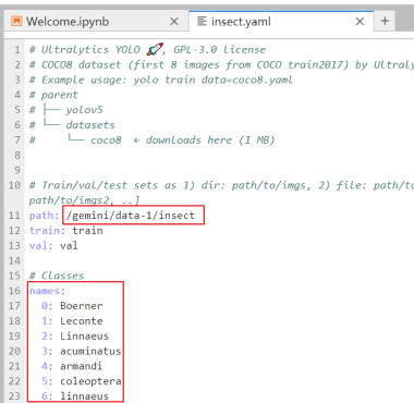 data="ultralytics/datasets/insect.yaml",epochs=100,device=0:data代表数据集地址,epochs是训练次数,device是训练时指定的是CPU还是GPU进行训练。