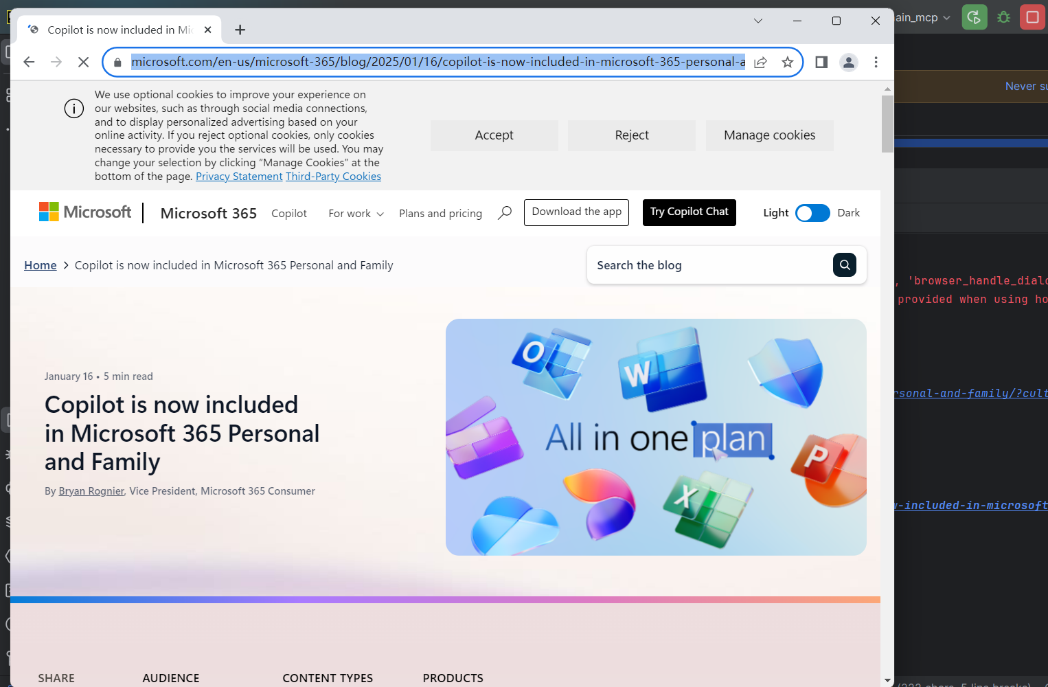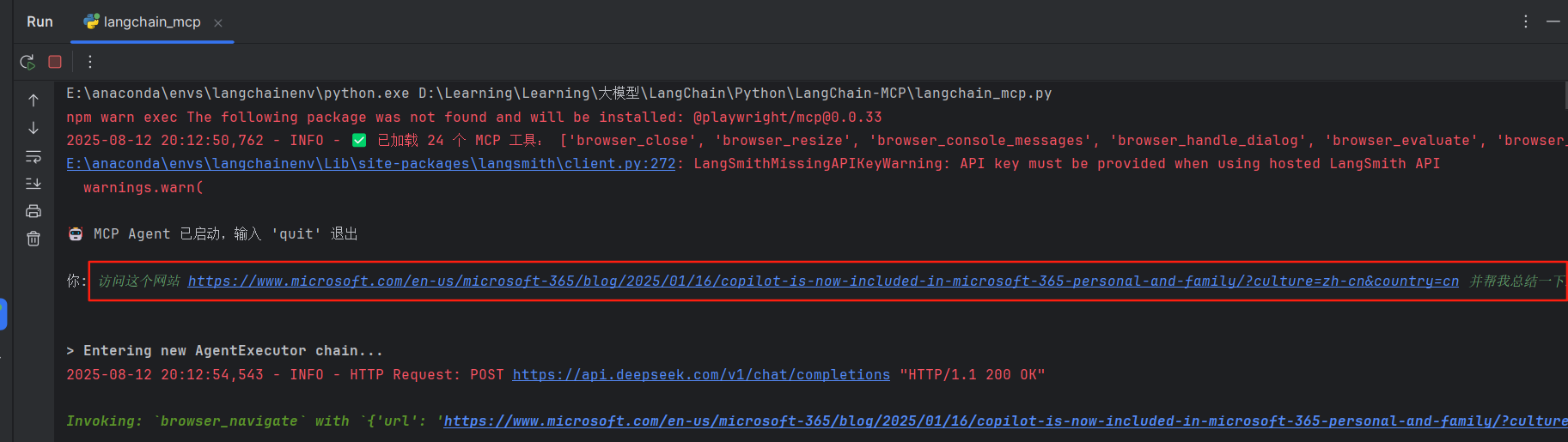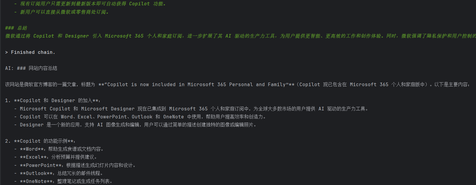 4. 编写主函数执行智能体,本期分享使用与上篇相同的案例,要求智能体爬取Copilot官方介绍页并总结相关内容, 提示词为"访问这个网站 https://www.microsoft.com/en-us/microsoft-365/blog/2025/01/16/copilot-is-now-included-in-microsoft-365-personal-and-family/?culture=zh-cn&country=cn 并帮我总结一下这个网站的内容",执行结果如下,可以看到PlayWright MCP自动打开浏览器并导航到相关页面进行爬取分析: