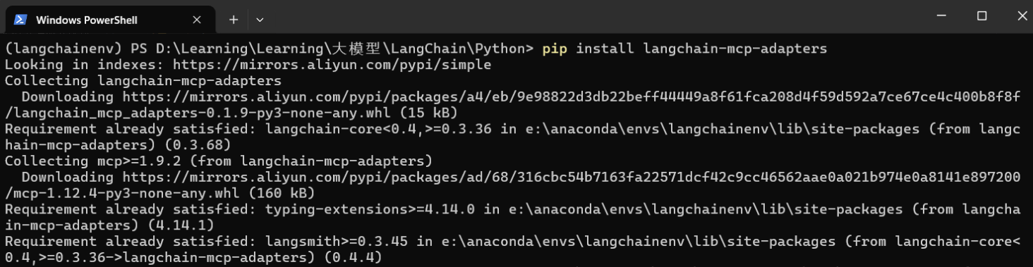 1. 首先在我们之前创建的anaconda虚拟环境langchainenv中执行如下命令安装LangChain MCP的相关依赖: