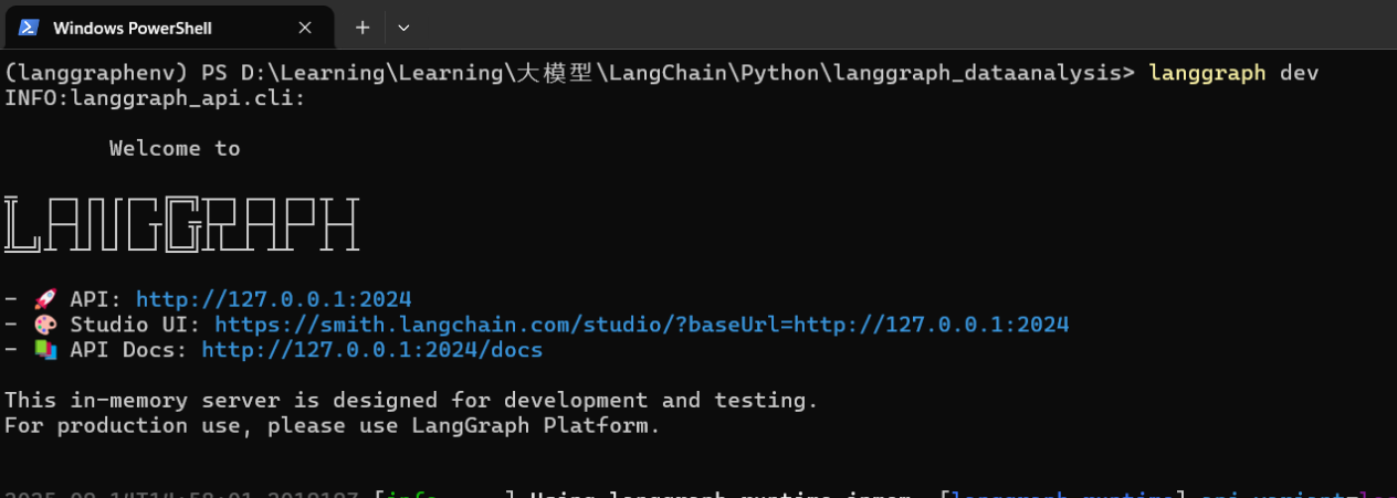 三、数据助手智能体部署上线 3.1 本地开启后端服务 在项目文件夹 langgrapn_dataanalysis下执行 langgraph dev命令, langgraph-cli即可自动开启后端服务。第一个url表示部署服务的api, 第二个url表示LangGraph Studio的地址,第三个url表示部署服务的api文档。