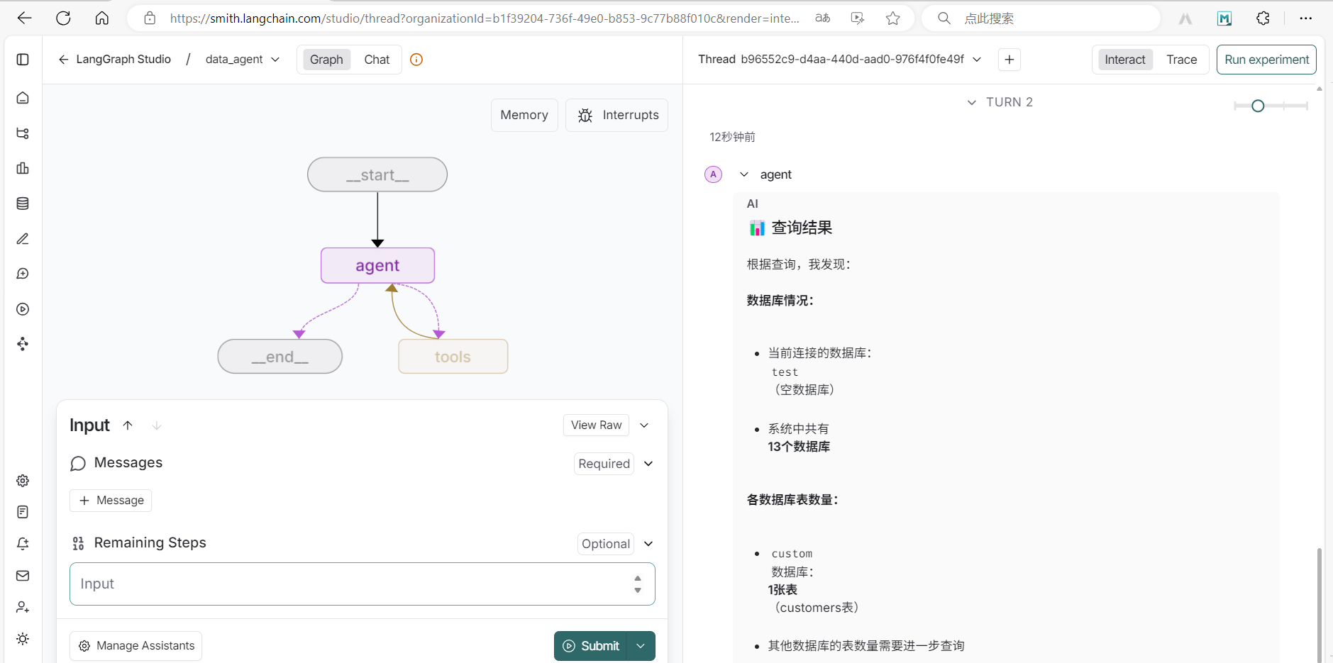 简单测试一下我们数据助手调用工具函数的能力,我们输入指令:“帮我查询数据库中一共有几张表?", 可以看到LangGraph成功调用了 sql_inter工具查询数据库中的表格,因为我们 test数据库是新建的,所以其中并没有表,而我们已有的 custom数据库中有一张 customers表,LangGraph返回的结果与预期正确。
