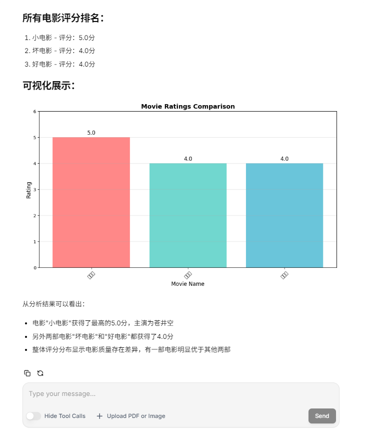 查看输出效果,可以看到智能体成功绘制了三部电影的电影评分并得到最高电影是“小电影,主演为苍进空"的正确结论。限于篇幅原因,这里就不再进行更多测试,大家可以在本地自行实现数据分析助手项目并完成更多的创意和测试。