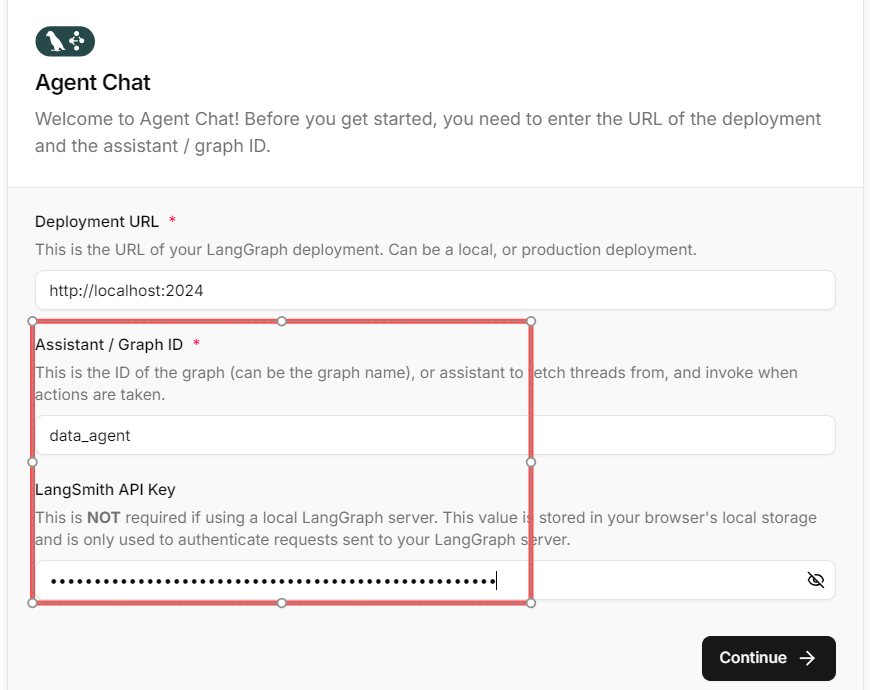 点击本地路径http://localhost:3000进入 agent-chat-ui的相关网页,需要进行登录并测试,这里需要填写Agent名称,也就是我们在 langgraph.json文件中定义的名称 data_agent,并可选输入LangSmith的API Key,点击Continue即可顺利开启Agent Chat UI页面并进行对话( 特别注意: 一定要将 graph.py中图片的输出路径设置为 agent-chat-ui文件夹中的 public文件夹):