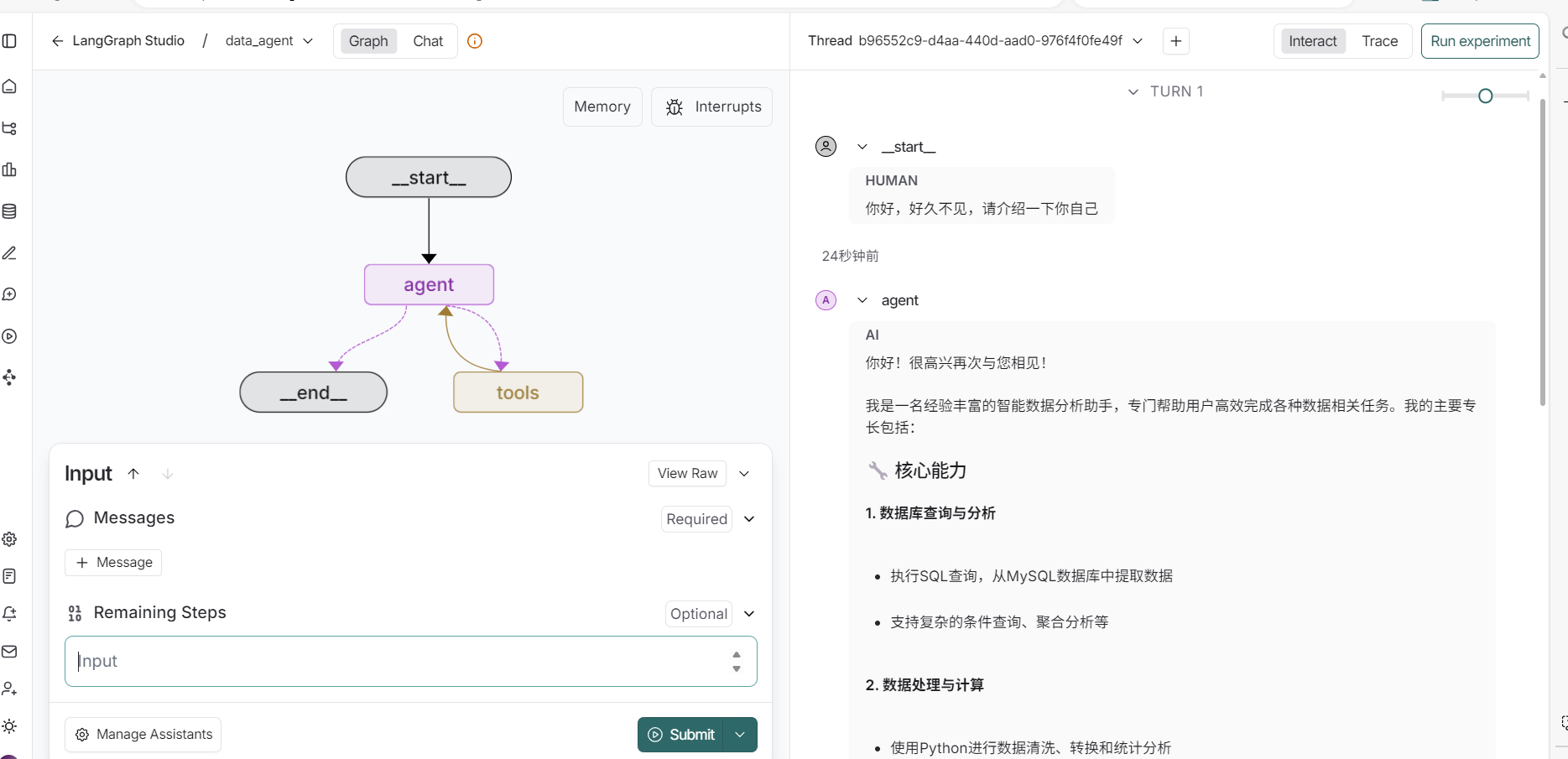 我们首先访问第二个地址打开 LangGraph Studio的界面,输入“你好,好久不见,请介绍一下你自己”,可以看到智能体清晰认识到自己数据分析智能助手的定位。
