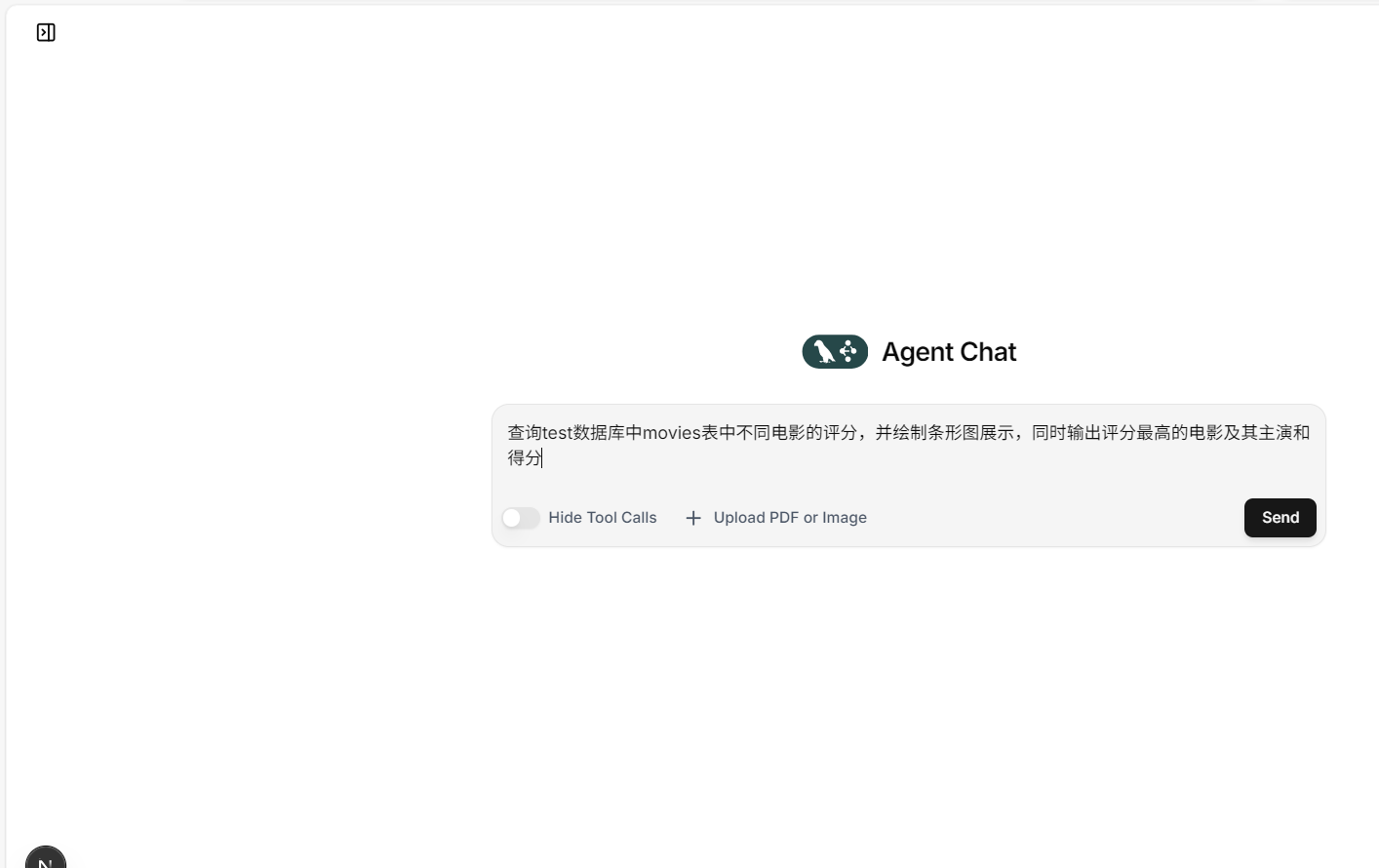 四、数据助手智能体项目演示 部署完成后我们需要尝试并实验 Agent Chat UI的相关功能,测试数据是否可以被正确查询,是否可以执行正确代码得到可视化图表,可视化图表是否可以在前端正常展示。