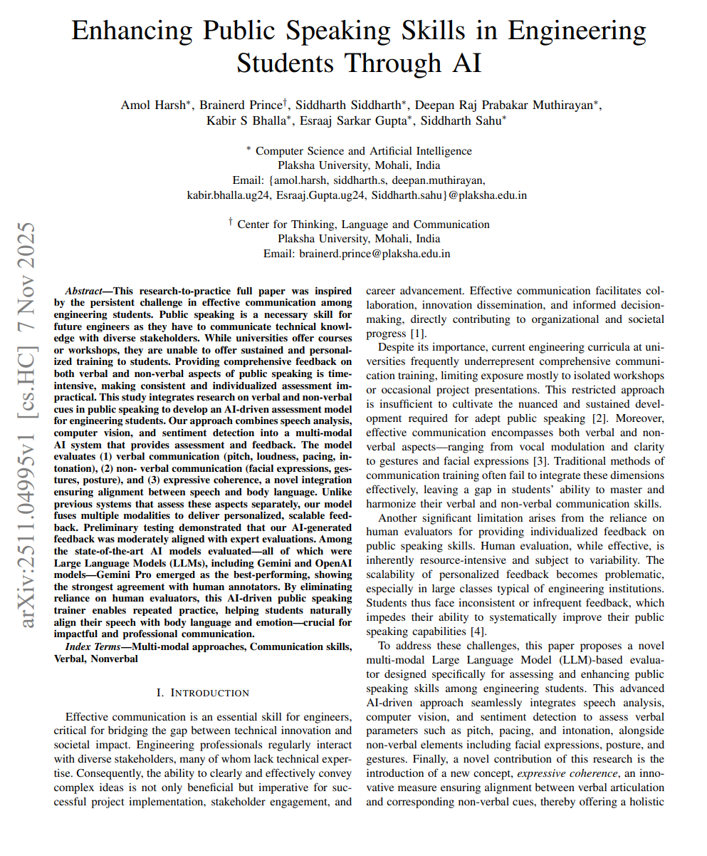 该系统融合了语音分析、计算机视觉和情感识别,能够同步评估演讲者的语言和非语言表现。