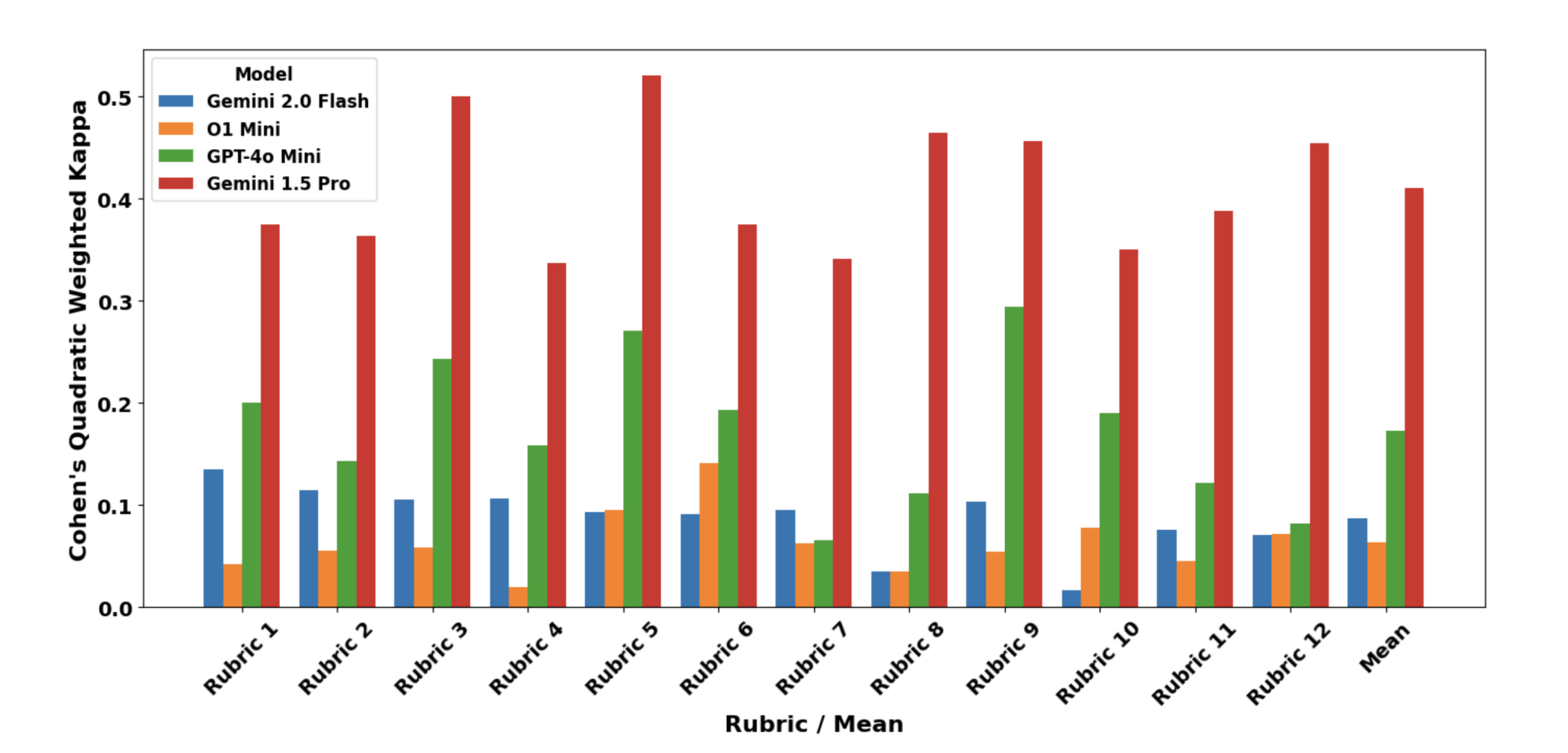 通过Cohen's Kappa系数(一种衡量评估者一致性的统计指标)与人类专家评分对比,Gemini 1.5 Pro以平均Kappa值0.41领先,尤其在声音表达”rubric 上达到0.45,显著优于GPT-4o Mini的0.29。