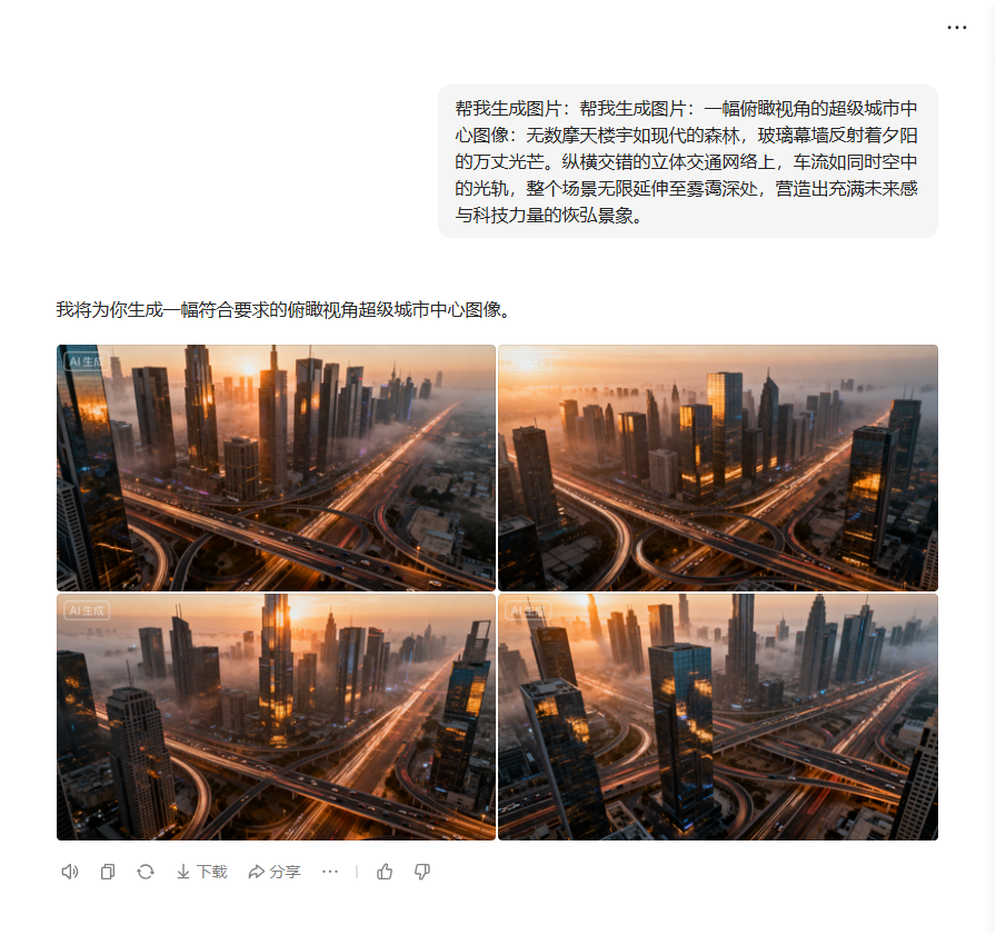 | 无数摩天楼宇如现代的森林,玻璃幕墙反射着夕阳的万丈光芒。纵横交错的立体交通网络上,车流如同时空中的光轨,整个场景无限延伸至雾霭深处,营造出充满未来感与科技力量的恢弘景象。 | 以中心摩天大楼为焦点,环绕运镜,保持主体稳定 |