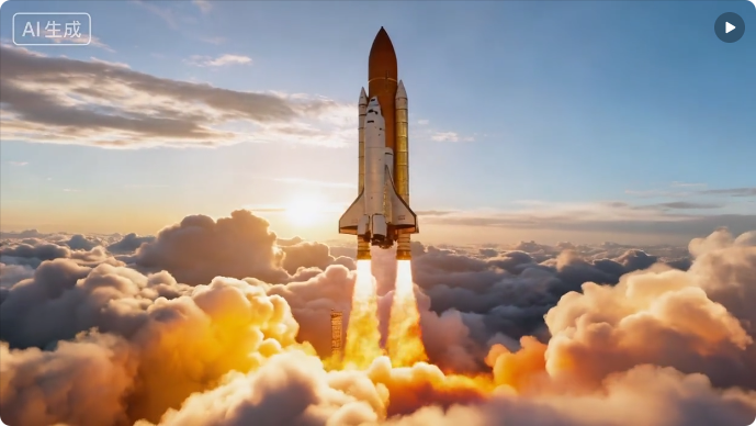 | 一枚火箭突破云层腾空而起,橙红色尾焰撕裂晨曦,金色侧光勾勒出金属质感,冷蓝色天幕与暖色火光强烈对冲。画面纵深极强,仰视广角构图,纪录片级真实感。 | 以火箭为焦点,环绕运镜,保持主体稳定 |
