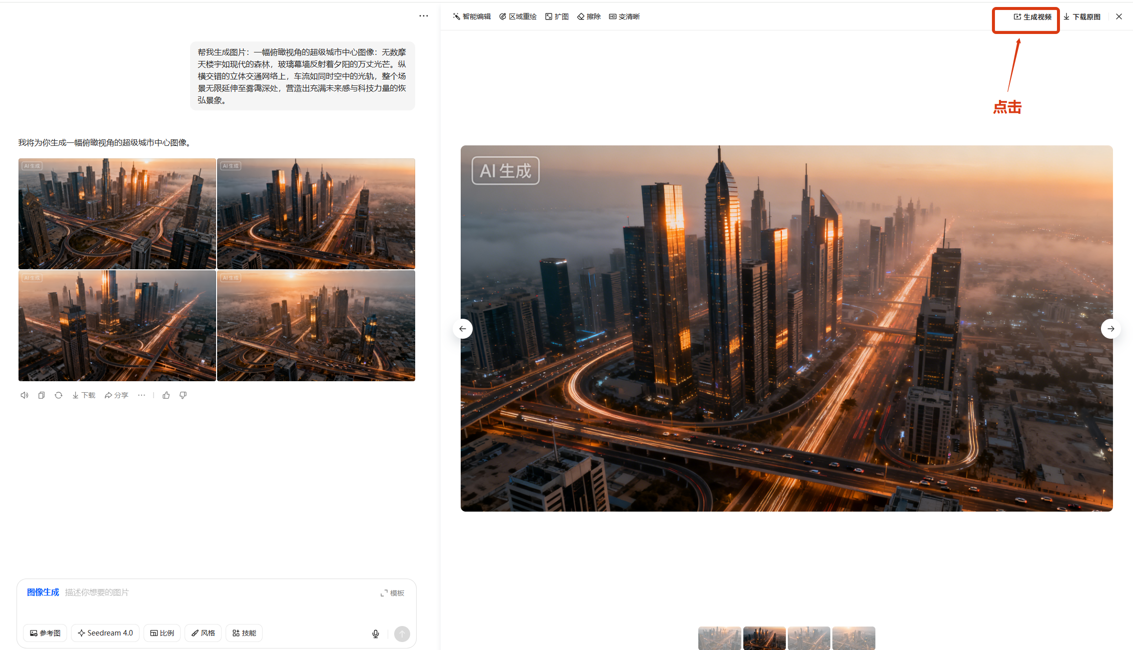 Step2️⃣: 施展动态魔法。从生成的图片中,选择最满意的一张,点击页面右上角的 “视频生成” 按钮。