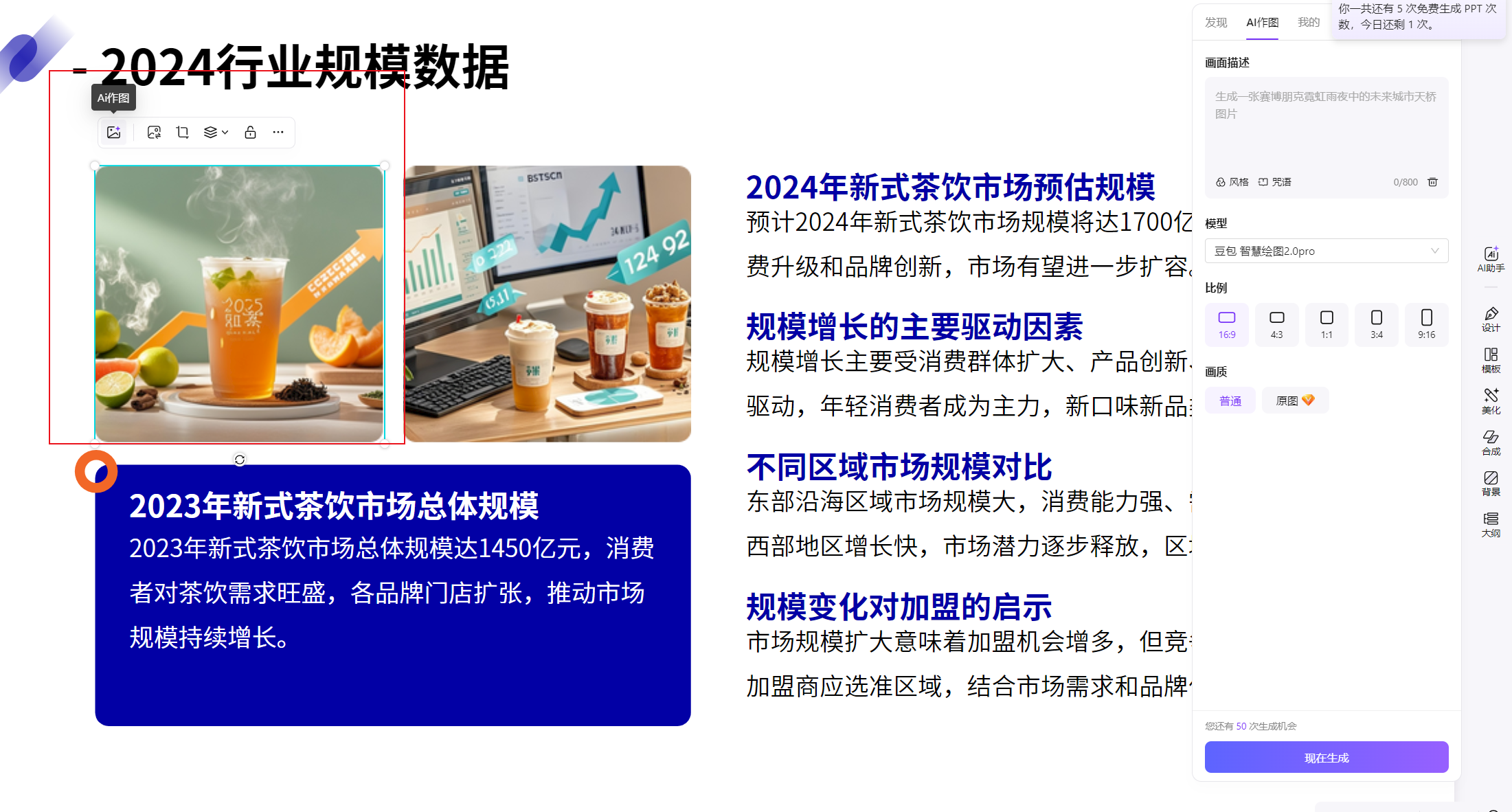 ● 替换图片:点击默认图片→右侧「图片设置」→「替换」,上传项目实景图(如门店照片、产品图),AI 自动裁剪适配版式