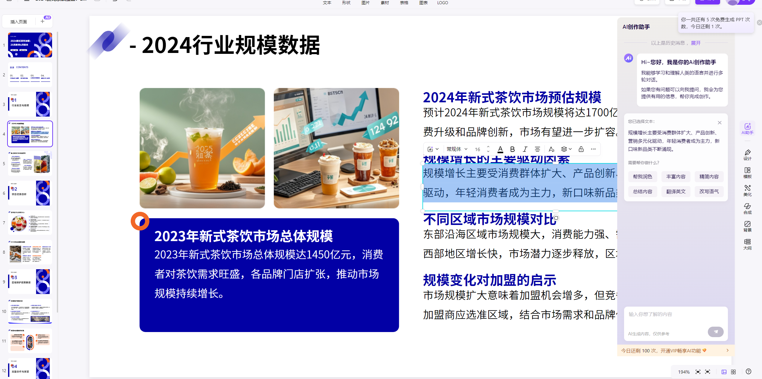 ● 点击任意文本框,唤出「内容优化」→ 选择「招商话术」,AI 自动将口语化文字改为专业招商表达(如 “赚钱快”→“投资回报周期短至 6 个月”)