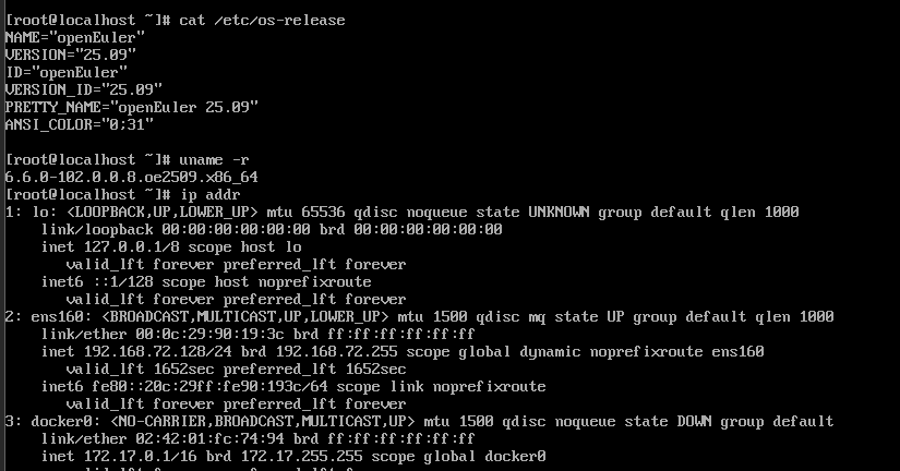 cat /etc/os-release中VERSION="25.09"、PRETTY_NAME="openEuler 25.09"确认) - 内核与硬件架构