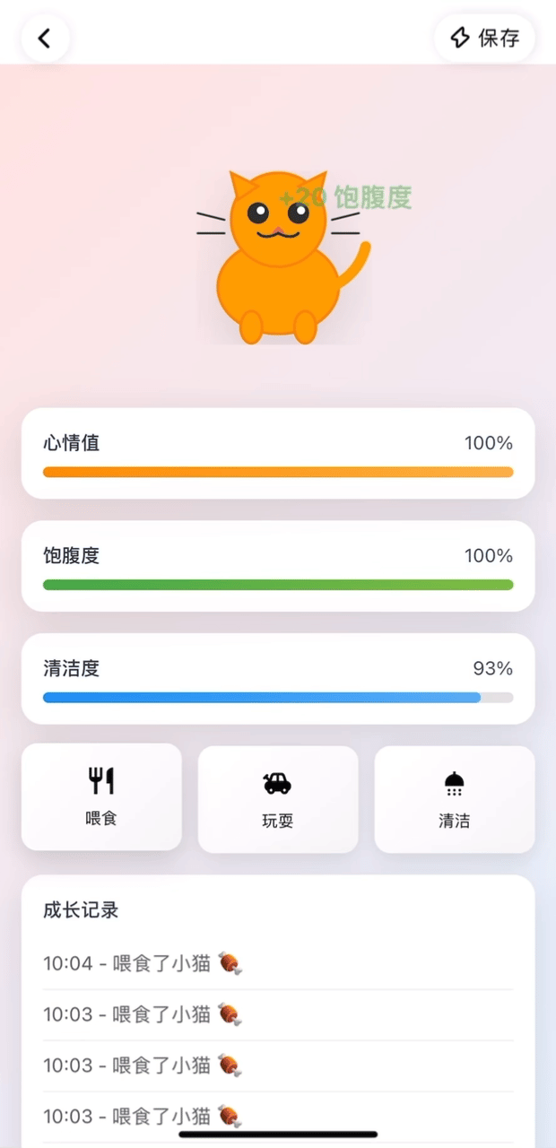 例如:做一个云养猫的互动小应用,界面要清新可爱,适合手机展示。包含:一只动态SVG超可爱小猫形象,点击小猫会有各种emoji表情以及音效,有喂食、玩耍、清洁等基础功能按钮;猫咪心情和健康状态显示;简单的成长记录。使用柔和的配色,圆润的UI元素,添加可爱的动画效果。整体氛围要轻松治愈,让人感受到云养猫的温暖陪伴感。