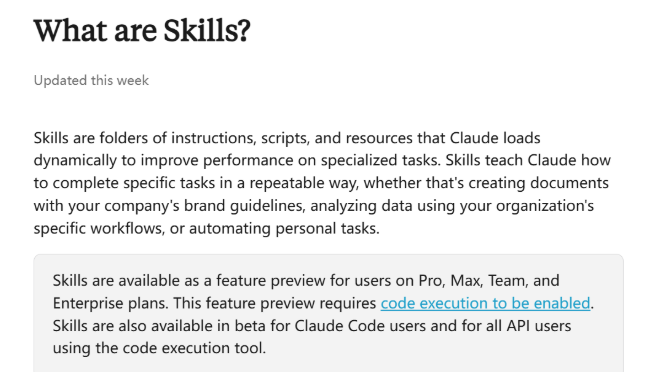 Skills的定义: 它是一个包含指令、脚本和资源的文件夹结构,AI可以动态加载这些内容来提升特定任务的执行能力。用技术术语来说,Skills是Agent的可插拔知识与流程模块。
