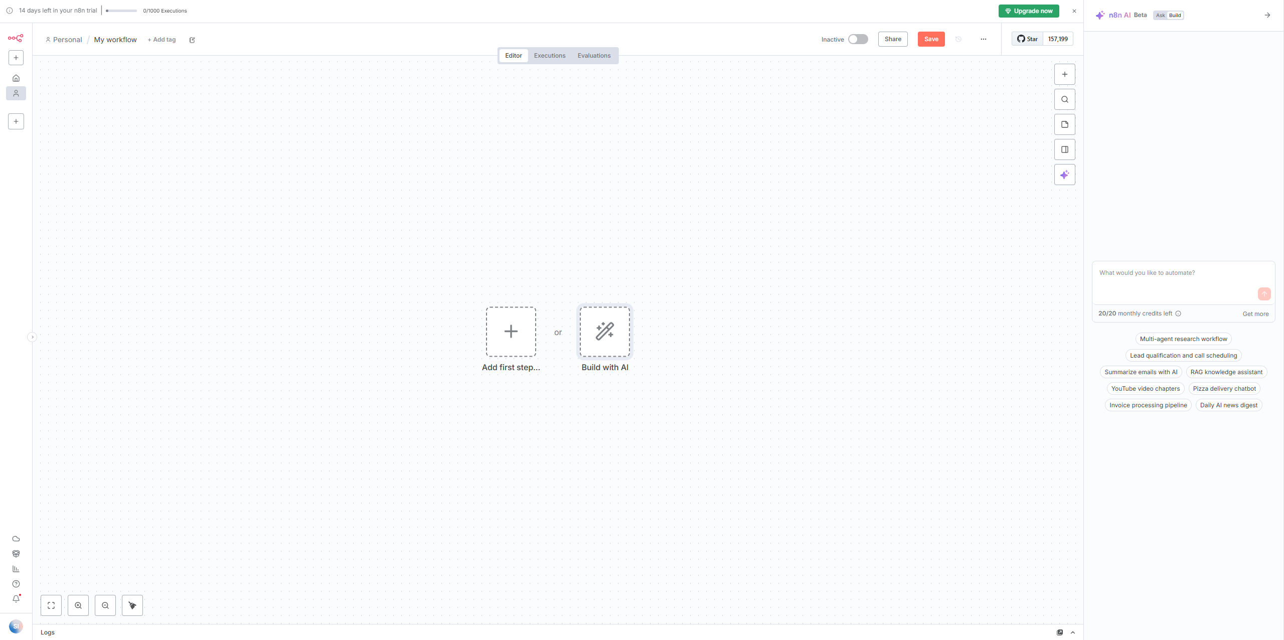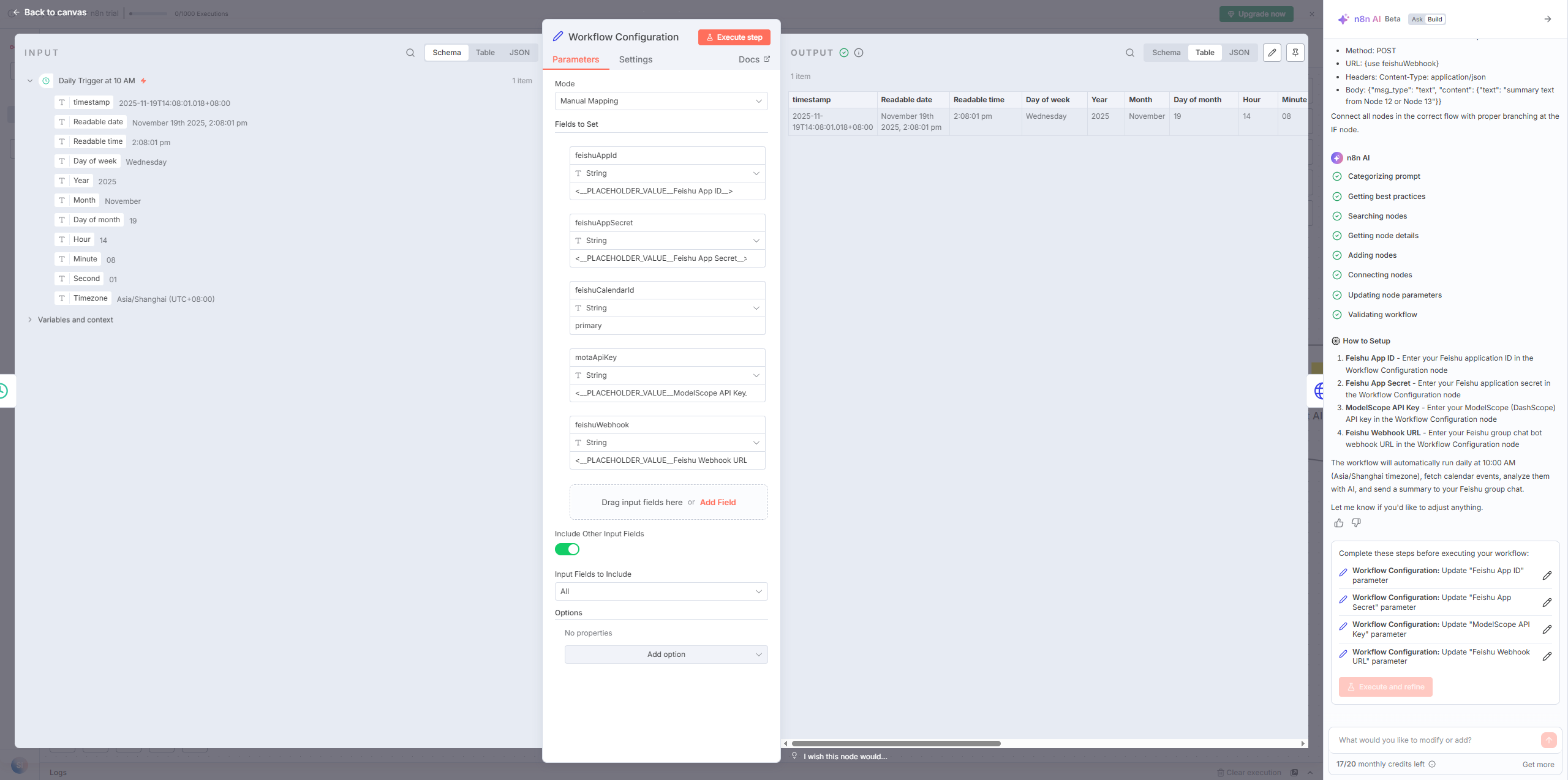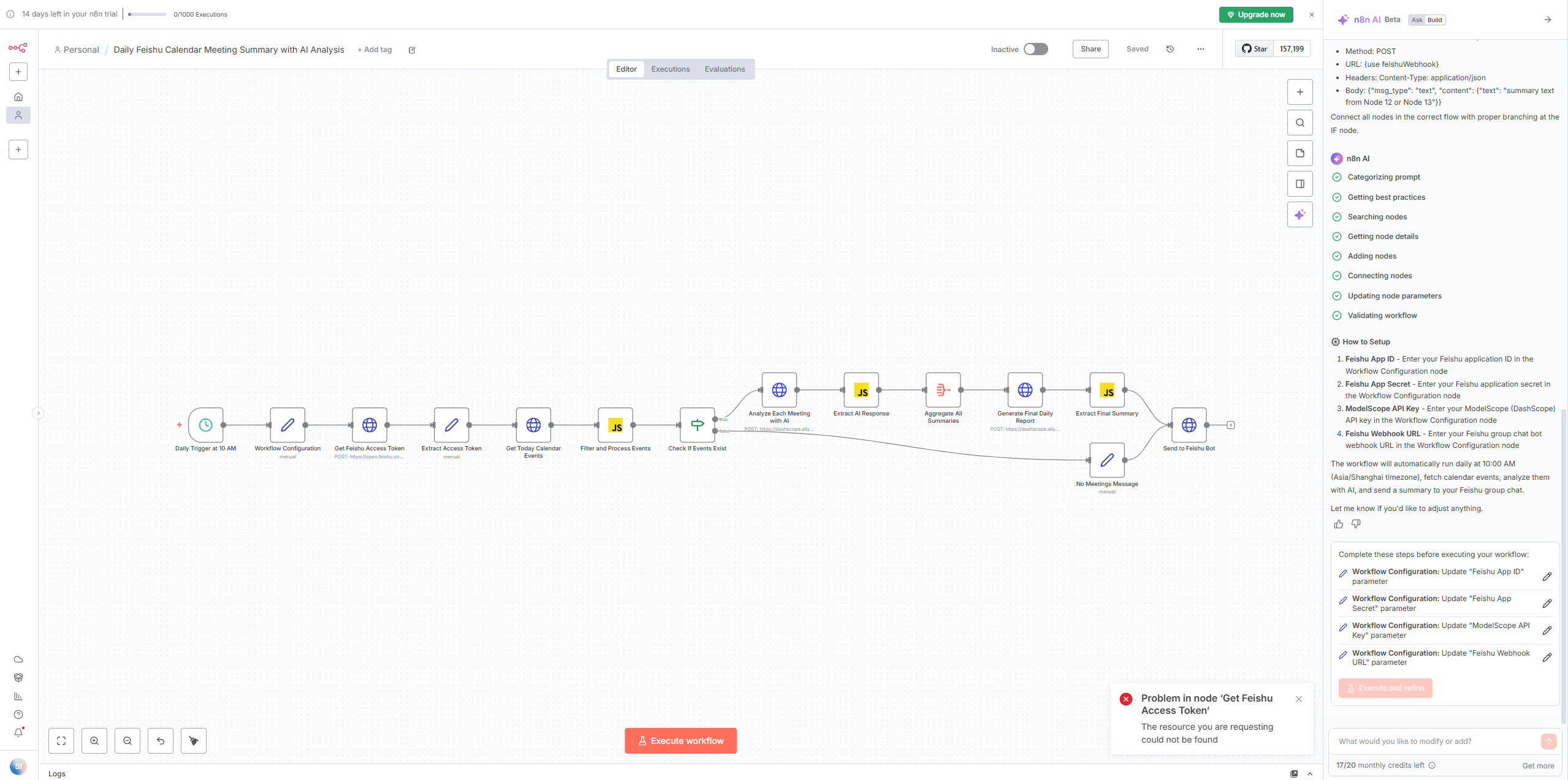 注意:n8n 的 AI 构建器会消耗积分(免费版每月 20 个),每次生成或修改算 1 次,失败不扣分。