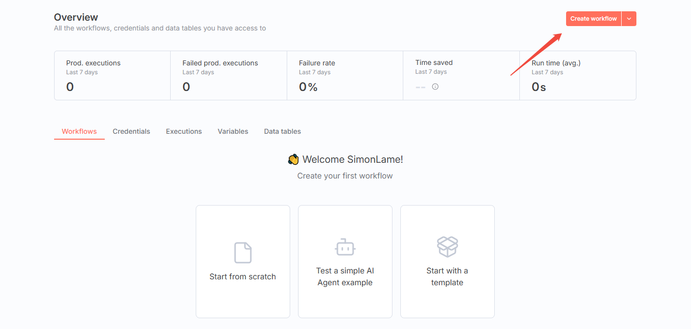 第一步 启用 n8n AI 工作流构建器 1. 登录 n8n 后,点击左上角 + 创建新工作流