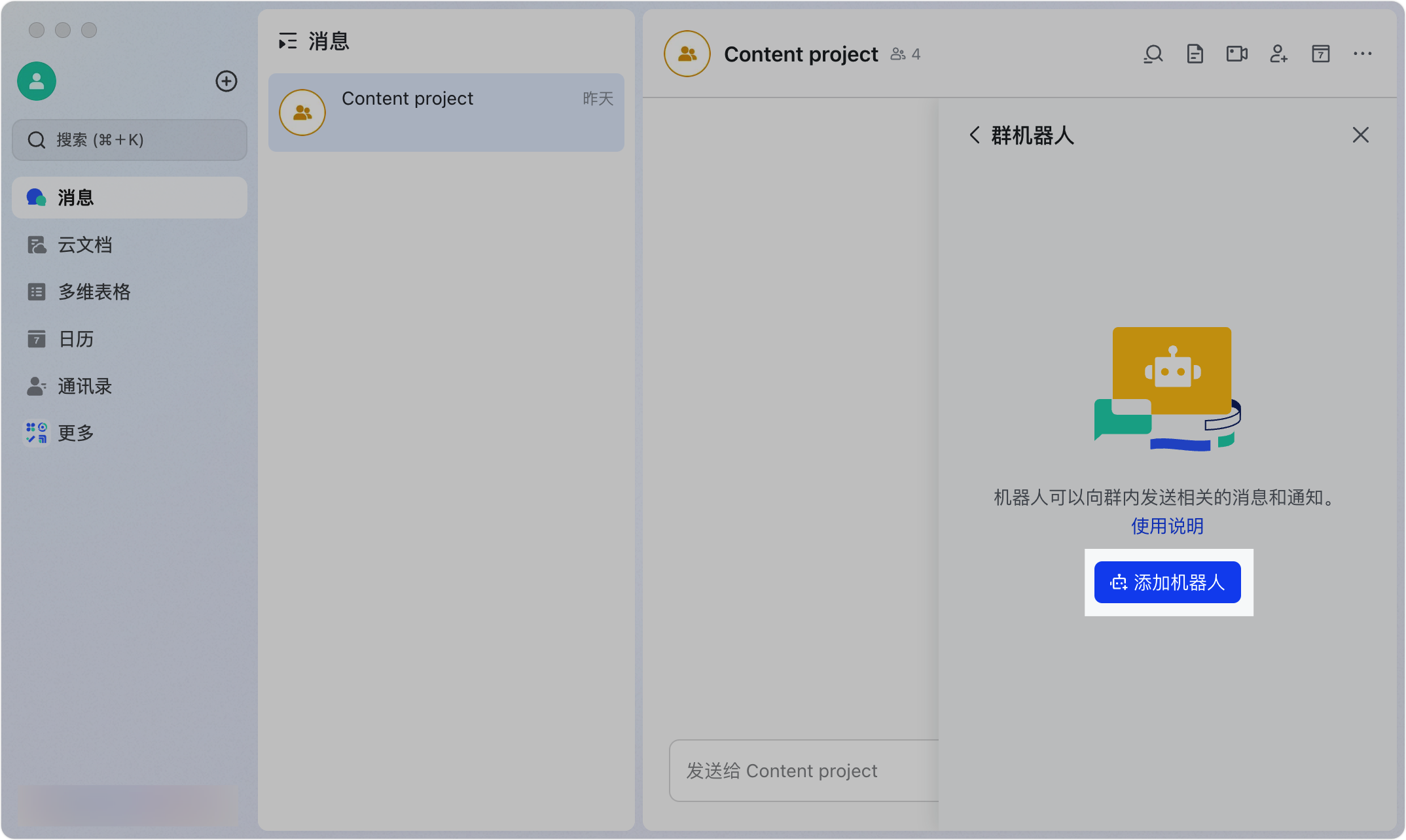 4. 创建一个飞书群聊并添加机器人