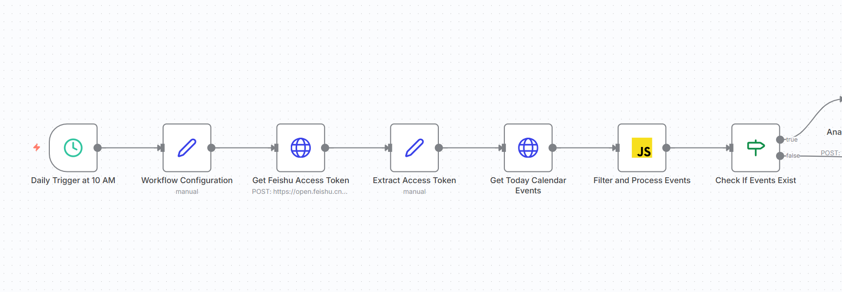 第三步 配置飞书日历节点 生成的工作流中,第一个实际执行节点需要接入飞书 API。