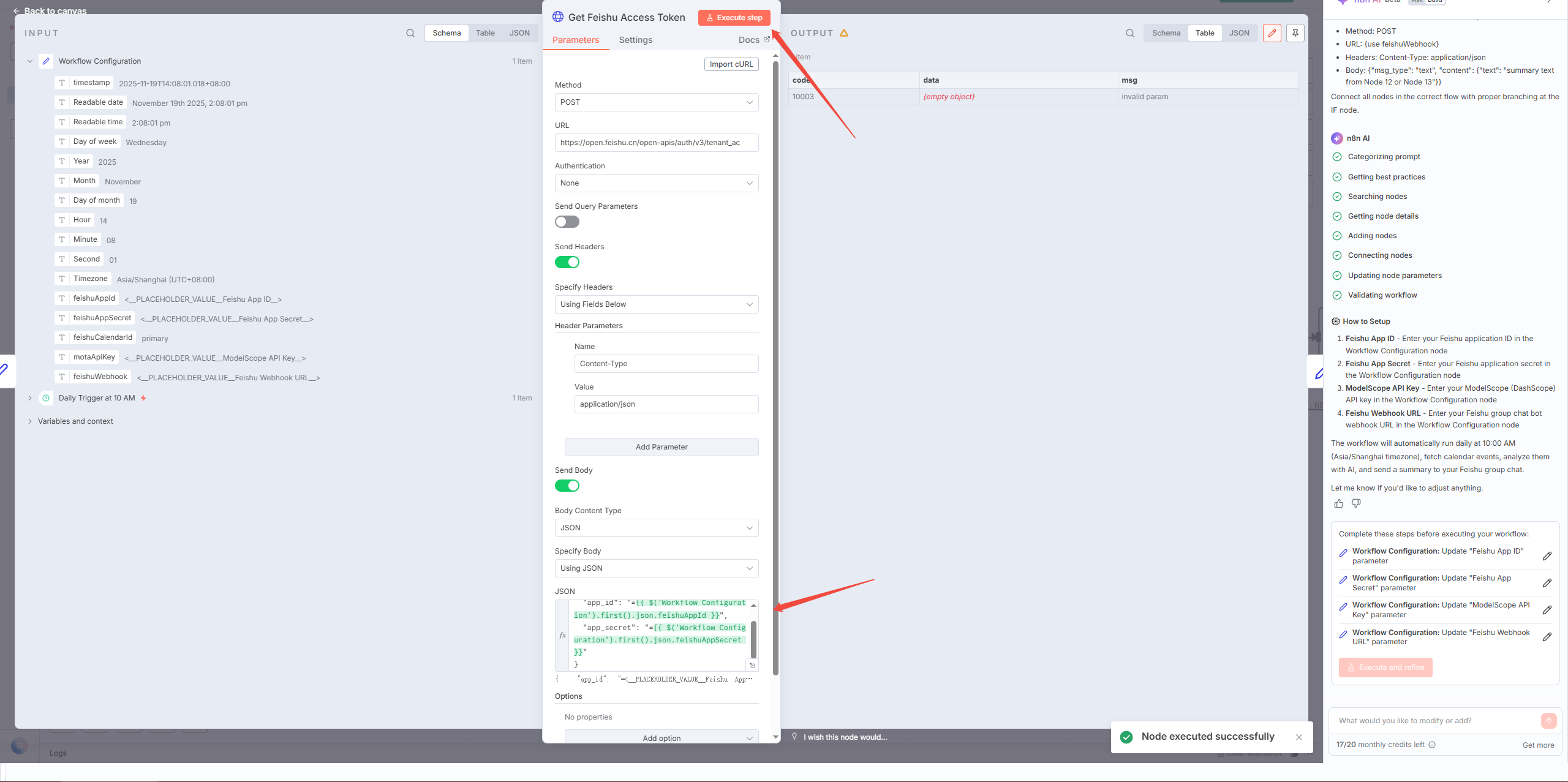 第四步 修改 Get Feishu Access Token 节点 AI 生成的这个节点存在 JSON 格式错误,需要手动修改。