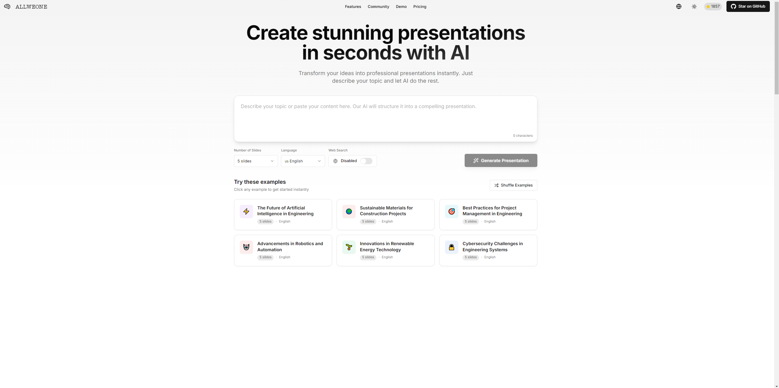 这款工具灵感源自Gamma.app:[ALLWEONE Presentation] 但更懂中文用户需求——AI生成+全自定义+开源免费,三大核心优势直接戳中痛点: