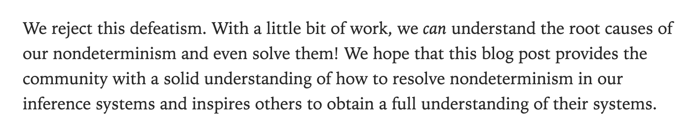 “我们拒绝这种失败主义。只要稍微努力一点,我们就能理解非确定性的根本原因,甚至解决它们!”
