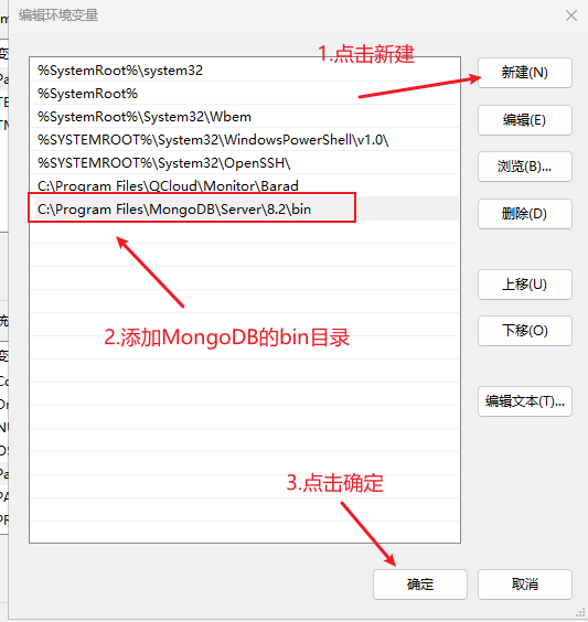 点击"新建",添加MongoDB的bin目录路径: