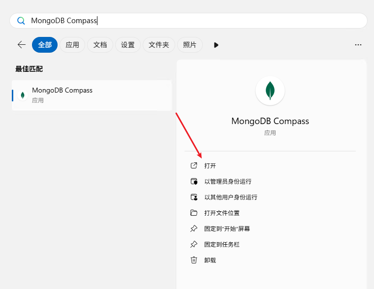 在开始菜单中找到"MongoDB Compass"并启动