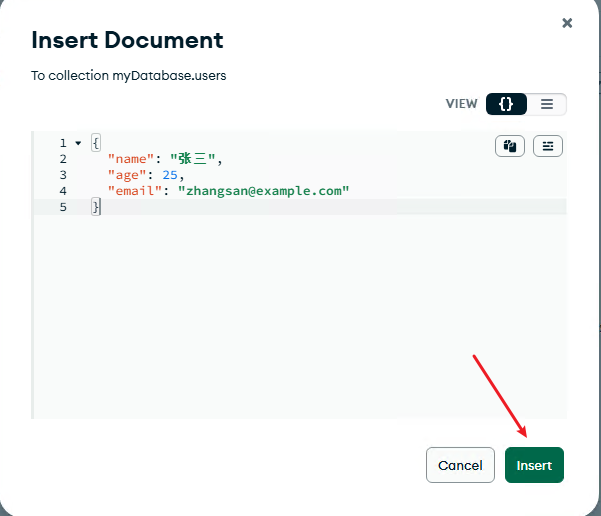 在集合中添加文档,点击"INSERT DOCUMENT"
