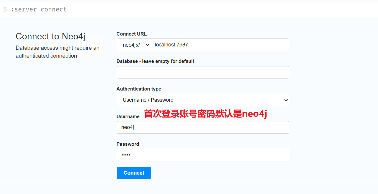 首次登录的话会看到Neo4j浏览器登录界面,默认用户名neo4j,默认密码neo4j,输入后点击Connect连接
