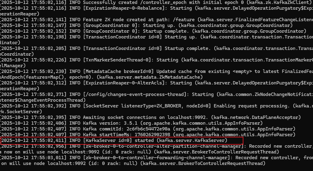 看到"started (kafka.server.KafkaServer)"表示启动成功。