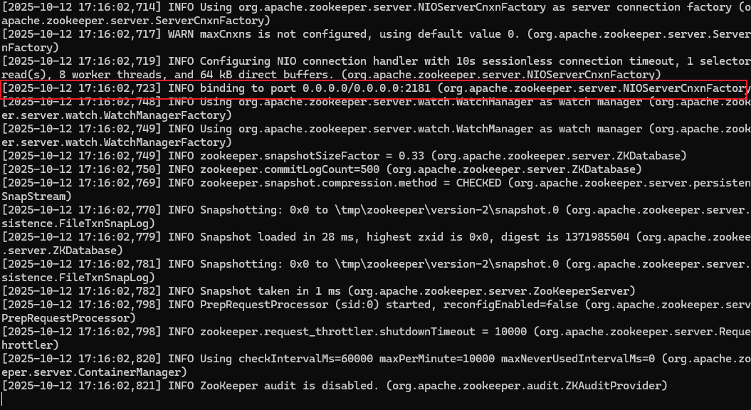 看到"binding to port 0.0.0.0/0.0.0.0:2181"表示启动成功。