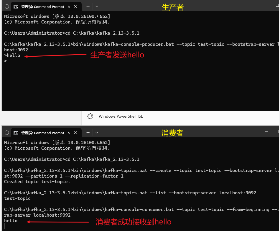 在生产者窗口输入消息,消费者窗口应该能实时接收到。