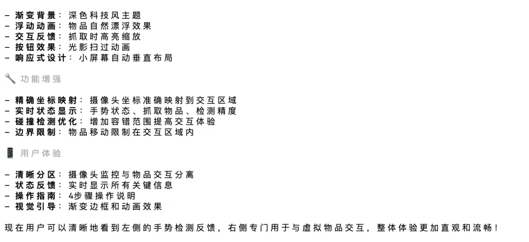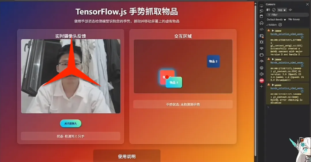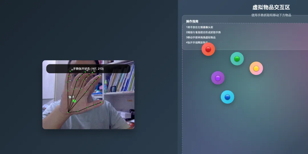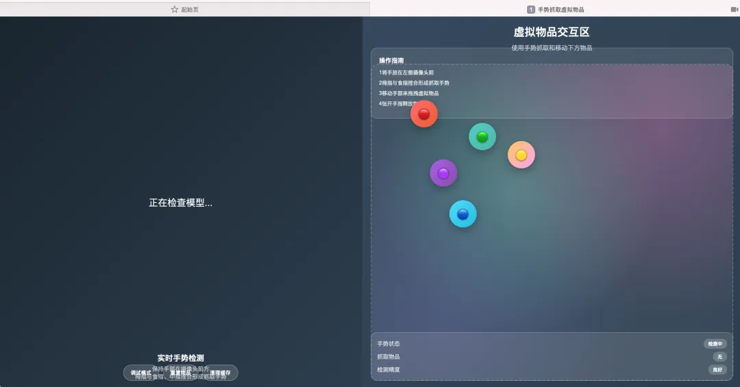 优化界面 左边为实时摄像头反馈 右边交互区域,可通过手势抓取物品