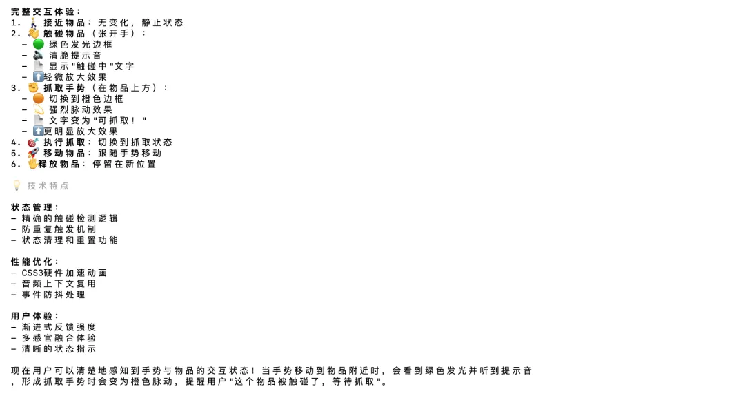 我要开发一个浏览器端应用,功能是用 TensorFlow.js 实现“手势抓取虚拟物品”。具体需求:1. 调用摄像头,通过 TensorFlow.js 加载手部姿态检测模型(类似 MediaPipe Hands 能力),实时输出手部关键点、手势状态(是否检测到手、手掌开合度等)。2. 在页面中用 Canvas 或 HTML 元素渲染虚拟物品,当手势满足“抓取条件”(比如手掌闭合、关键点覆盖物品区域)时,物品跟随手势移动。3. 需处理摄像头权限、模型加载失败等异常,还要优化性能(避免推理卡顿、交互延迟)。希望你能指导:- TensorFlow.js 手部模型选型(比如推荐适合浏览器端、轻量且精度足够的模型)及加载、推理的代码流程。- 手势“抓取判定”的具体算法逻辑(如何映射坐标、判断交互条件、处理物品跟随)。- 前端界面(摄像头预览、交互区、状态提示)与 TensorFlow.js 结合的实现要点。- 性能优化的关键手段(比如帧处理策略、模型推理异步化)。麻烦从技术方案框架、核心代码片段(或伪代码)、易错点提醒(如跨域、坐标转换问题)等方面详细说明,感谢!