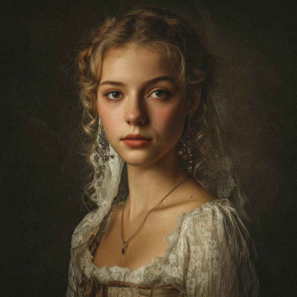 2、控制对比度(情绪感): 伦勃朗光的核心价值在于情绪化(Moody)和戏剧性(Dramatic) 。要提升人像的情感深度,可以在Prompt中加入intense gaze(凝视), pensive(沉思的), 或melancholy(忧郁的)等情绪词,并搭配“dark background(深色背景)”来进一步增强对比度,突出脸部的光影效果 。