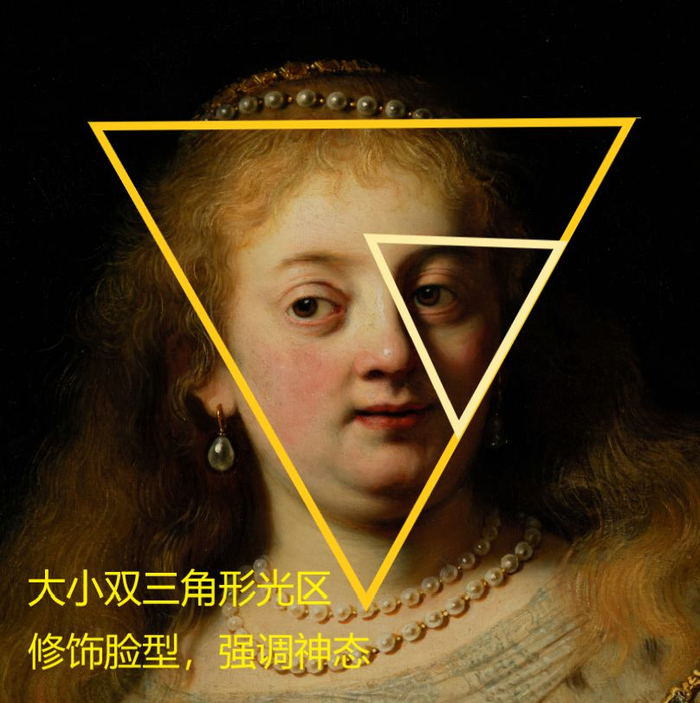 伦勃朗光的最大特点,是在被摄主体脸部的非受光一侧(即背对光源的一侧)眼下方,形成一个倒三角的亮区。