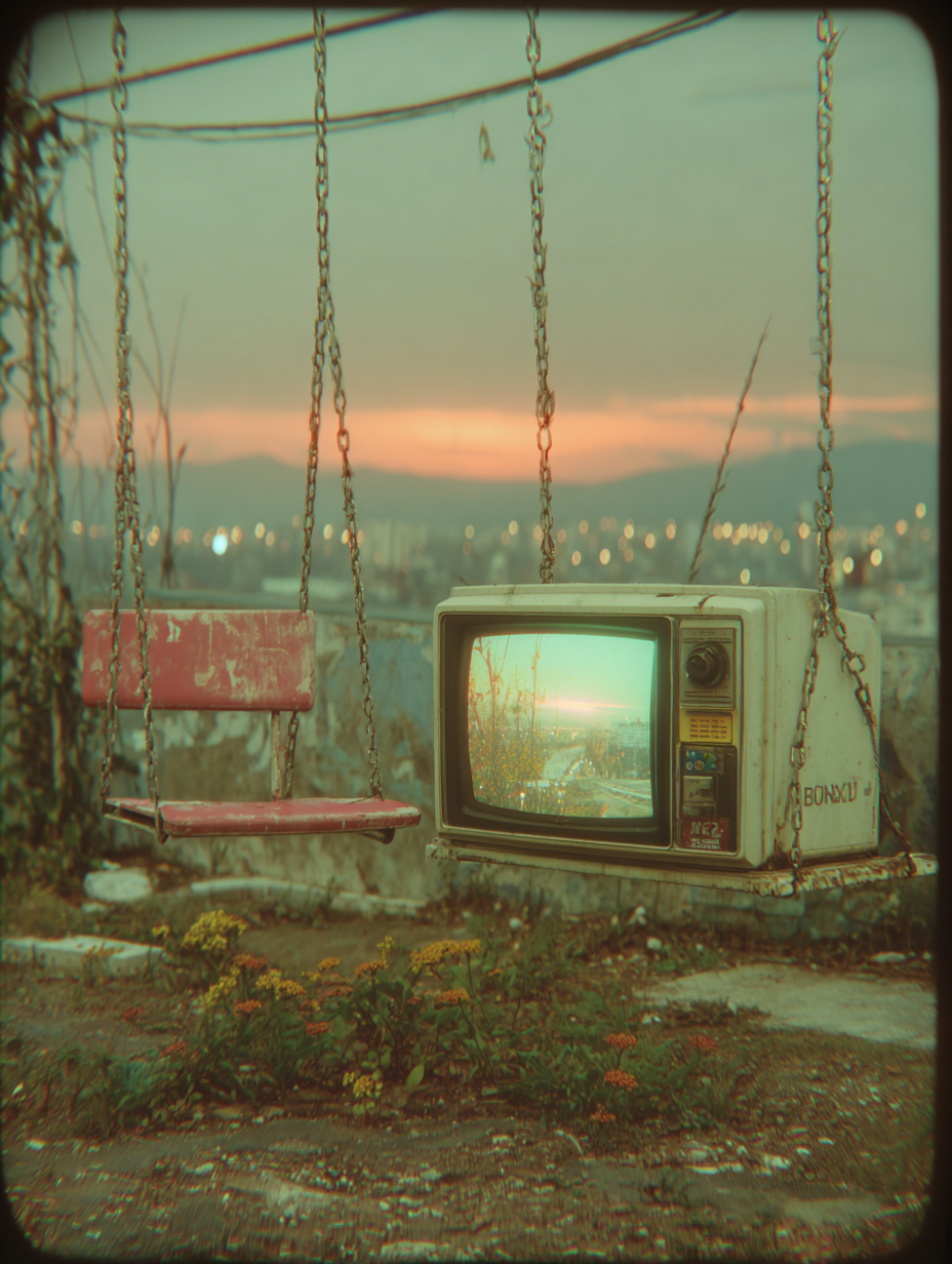 核心提示词:柔和的光线、模糊的边缘、破碎的记忆、复古的物件与场景(如老式电视、童年玩具、游戏厅、游乐场、老旧小区、澡堂等)、漂浮的物体、不合常理的场景组合
